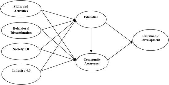 Many articles discuss the issue of sustainable development, but from the perspective of implementing its tasks and the readiness and awareness of students in relation to sustainable development [13,14,15,16,17,18]. This article fills the gap by assessing students’ levels of agreement (latent construct) with regard to examining the causal relationship between predictors (Skills and activities, Behavioral dissemination, Society 5.0, and Industry 4.0) and mediating (Education and Community Awareness) and outcome (Sustainable Development) variables. Partial Least Square Structural Equation Modeling (PLS-SEM), a multivariate statistical method, was used. Moreover, the link between Education, Community Awareness, Sustainable Development, Skills, Behavior dissemination, encouraging sustainable development, and the interaction between universities and society are also examined in this manuscript, which is novel in its work. This study aimed to evaluate the students’ agreement level (latent construct) for examining the causal relationship between predictors (Skills and activities, Behavioral dissemination, Society 5.0 and Industry 4.0) and mediating (Education and Community Awareness) and outcome (Sustainable Development) variables. The experiment made use of the CAWI questionnaire. The correlations between the various characteristics were then confirmed using statistical techniques. The authors then used SEM structural equations, which enabled them to ascertain the relationships between the overlapping components and look for probable connections between the survey’s questions.