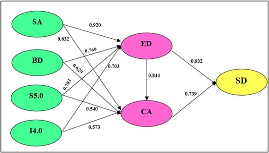 Figure 2 reports the output of PLS-SEM in the form of the explanatory power of selected constructs, predictors (Skills and activities, Behavioral dissemination, Society 5.0 and Industry 4.0), mediating (Education and Community Awareness), and outcome variables (Sustainable Development). The model explains the variance in each predictor, mediating, and outcome variable due to each indicator, predictor variable, and mediating variable, respectively. The variances of each predictor variable, including Skills and activities, Behavioral dissemination, Society 5.0, and Industry 4.0 in Education (mediating variables) were 0.920, 0.769, 0.783, and 0.703, respectively. In a percentage term (R2), these contributions are 84.64%, 59.13%, 61.30%, and 49.42%, respectively. This signifies that Skills and activities have the highest influence and impact on education, i.e., 84.64%, followed by Society 5.0, Behavioral dissemination, and Industry 4.0. Likewise, the variances of each predictor variable, including Skills and activities, Behavioral dissemination, Society 5.0, and Industry 4.0 in community awareness (mediating variable), were 0.632, 0.629, 0.540, and 0.573, respectively. In a percentage term (R2), these contributions are 39.94%, 39.56%, 29.16%, and 32.83%, respectively. This signifies that Skills and activities have the strongest influence and impact on community awareness, i.e., 39.94%, followed by Behavioral dissemination, Industry 4.0., and Society 5.0. Moreover, the mediating variable education is associated with community awareness (another mediating variable) with 0.844 variance, which shares 71.23% in overall community awareness. Lastly, education plays a very high and significant role in sustainable development, with a 0.932 variance and 86.86% sharing. By contrast, community development is also a detrimental component of sustainable development and has a 54.61% contribution. Based on the aforementioned PLS-SEM output in Figure 2, this model comprehensively investigated all the relationships between the predictor (Skills and activities, Behavioral dissemination, Society 5.0 and Industry 4.0), mediating (Education and Community Awareness), and outcome (Sustainable Development) variables and all the proposed alternative hypotheses were tested and achieved a 0.01 level of significance.