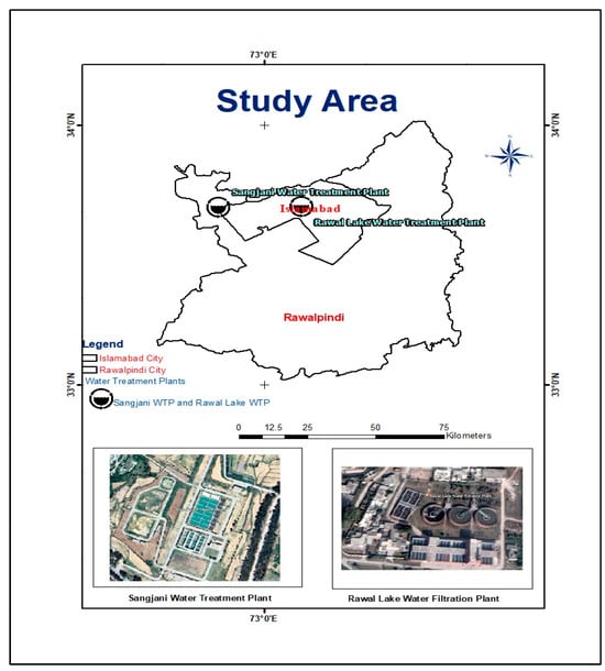 To effectively understand the unit processes and the operational parameters of an urban water system, the water treatment plants in the adjacent cities of Islamabad and Rawalpindi, Pakistan, were used as a case study example. The Rawal Lake Water Treatment Plant (RLWTP) and Sang-Jani Water Treatment Plant (SJWTP) are designed to supply drinking water to the residents of the twin cities, with an operating capacity of 23 MGD and 51.7 MGD, respectively. The drinking water supply of the RLWTP dates back to 1962. The plant draws its water from the Rawal lake and is managed by the Water and Sanitation Agency (WASA) under the Rawalpindi Development Authority (RDA). The major feeding channel to Rawal lake is the Korang River originating in the Murree Hills area [39]. The source water quality for the RLWTP is relatively turbid due to the impurities carried by the nearby rivers and streams. This plant is a surface water treatment plant focusing on the removal of pathogens, micro-pollutants, pesticides, and organic matter.