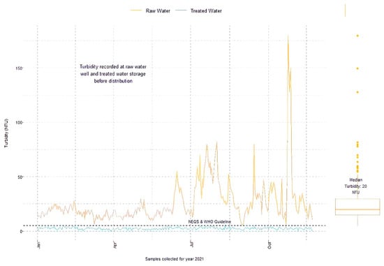 Water quality at the RLWTP for the year 2021. Left: Line plot of raw and treated water turbidity variation over 12-month period. Right: Box plot for the raw water turbidity.