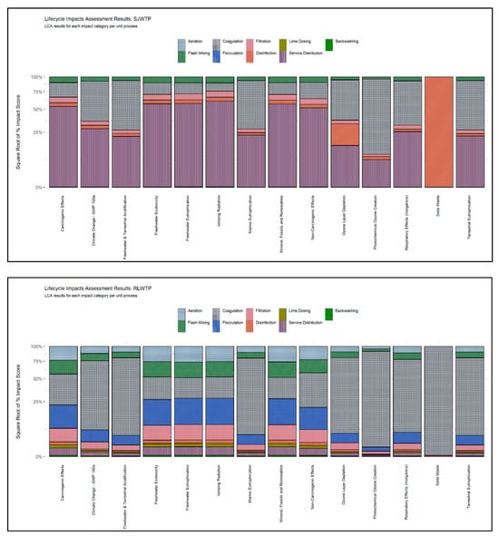 Life cycle impact results for SJWTP (top) and RLWTP (bottom). Distinct unit treatment processes are represented by color schemes with respect to the life cycle impact categories.