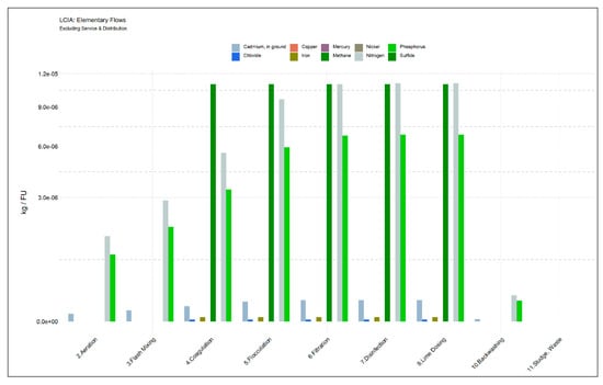 These impacts are to be attributed to the substantial release of carbon dioxide, carbon monoxide, and other toxic chemicals during the electricity generation, chemical manufacturing, and transportation sub-processes, as shown in Figure 5. The direct emissions from the operation of the water treatment plants must also be attributed to the life cycle impact categories. Withstanding that the inventory data for these direct emissions are yet to be established for most water treatment systems, the calculations listed in Supplementary Materials were employed to incorporate the air, land, and water emissions into the Lifecycle Assessment model. Most of the land and water emissions were from solid waste, organic content, metals, and salts. As for emissions to the air, the most frequently documented emissions include carbon dioxide, carbon monoxide, and methane.