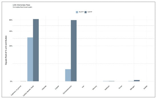 Life cycle impact results for SJWTP and RLWTP for the selected elementary flows. Each system is presented with a distinct color. The scale represents the cumulative percentage of each elementary flow.