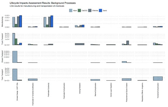 The contribution of background processes towards each impact category was assessed systematically for both treatment plants. The results of the impacts contributed by the chemicals and raw materials are presented in Figure 6 and the impacts contributed by electricity consumption are presented in Figure 7.