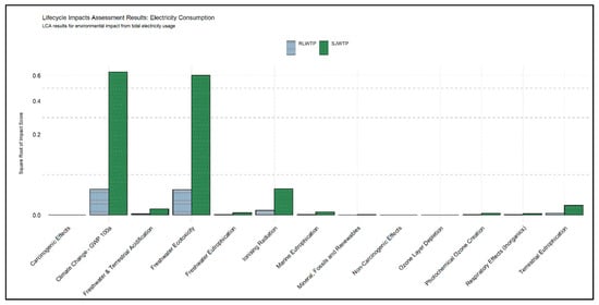 When analyzing each unit process with respect to the inputs and outputs, the highest environmental impacts observed were due to the electricity consumed during the plant (foreground) processes. Totals of 0.03 kWh and 1.13 kWh per cubic meter were consumed at the RLWTP and SJWTP, respectively. This was compared to similar sustainability and energy-consumption studies of water treatment systems which reported approximately 0.07 kWh [68], 0.38 kWh [69], 0.51 kWh [70], and 1.0434 kWh [71] per cubic meter of treated water production. This analysis highlights the significant role of energy consumption in the treatment process, which necessitates a judicious approach to resource allocation.