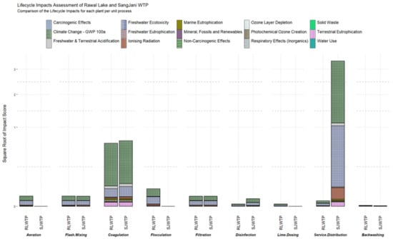 Figure 3 graphically represents the impact contributed by each unit process that is operational at the study plants. For the SJWTP, the results were dominated by the service and distribution process in all impact categories. This was due to the heavy reliance of the distribution pumps on grid electricity. The lifecycle impacts of the electricity grid powering the studied plants are further discussed in the following sections and Table S7.