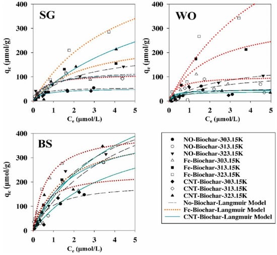The isotherm models for PFOA adsorption on different types of biochar at varied temperatures (323.15 K, 303.15 K, and 313.15 K) (reproduced with permission from the publisher; Wu, Qi [68]).