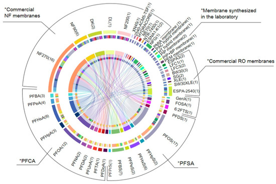 The current treatments used combined approaches and hybrid membrane technologies for the elimination and destruction of PFAS via adsorption, ion exchange, and membrane separation. In membrane separation, nanofiltration and reverse osmosis are efficient techniques for PFAS removal from wastewater. Novel membranes consisting of nanomaterials were the most efficient in removing PFAS. The cost of membrane treatment and ion exchange has been found to be very effective. Irrespective of the chain length or molecular structure of PFAS, Ross et al. reported that RO and NF are very efficient at eliminating several of them, particularly PFAA intermediates [120]. They highlighted the significant challenges inherent in these methods, such as the high cost of large-scale implementation, the difficulty of dealing with suspended particles and water geochemistry, and the difficulty of keeping membranes healthy, especially in groundwater applications. Figure 5 displays the NF/RO membranes that have been experimentally indicated to be effective in the removal of PFAS from water.