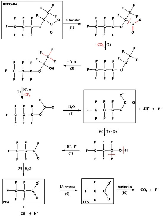 The most extensively researched approaches for PFAS destruction are electrochemical advanced oxidation processes (EAOPs), which produce highly susceptible hydroxyl radicals (OH•) with a high redox potential (E = 2.8 V versus SHE). They may generate immiscible alcohol compounds to break C–F bonds. Due to its efficacy and simplicity in current water treatment facilities, anodic oxidation is a popular EAOP [143]. Using ultraviolet light and persulfate, [144] investigated the oxidation of hexafluoropropylene oxide tetramer acid (HFPO-TeA), reporting that HFPO-TeA depolymerizes to Hexafluoropropylene oxide trimer acid (HFPO-TA), which in turn depolymerizes to HFPO-DA.