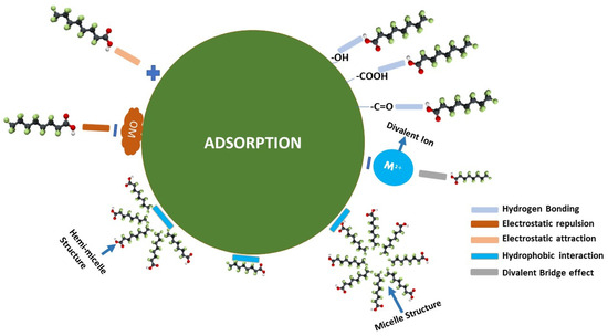 Adsorption of PFAS onto carbon nanotubes (CNTs) is a complex process that has not yet been fully elucidated. Du et al. concluded in their review that hydrogen bonding interaction is not likely to be involved in the adsorption process of PFCAs on CNTs [70]. Recent research reveals that charge-assisted hydrogen bonding may react with the carboxyl group of the PFCAs and the functional group on the CNT surface to adsorb ionizable molecules on CNTs.