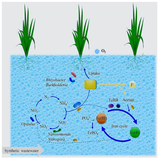 Other interactions, including hydrogen bonding, fluorine-fluorine interactions, and ligand exchange (although weakly), were shown to influence the adsorption of PFAS in eight more investigations. Research was conducted by Ma et al. to assess the influence of iron minerals in laboratory-scale parallel-constructed wetlands (CWs) for the elimination of PFOA and PFOS [151]. To remove PFOS and PFOA from CWs, iron minerals of different shapes and sizes were used as substrates, with the goal of optimizing microbial degradation and substrate efficiency. The maximum removal of PFOA and PFOS (57.2% and 63.9%) was exhibited by MC2 (Gravel:Magnetite, 1:2). The concentration of PFOA and PFOS in the effluents were decreased when iron minerals were added to CWs, relative to the control group. Their elimination is aided by electron transfer and denitrification, both of which are favorably linked with iron content (Figure 9) [151,152]. Moreover, because of the increased translocation factor of PFOA in CW, its removal was more successful than that of PFOS.