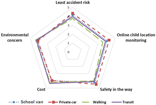 Moreover, the importance of various factors, such as environmental concerns, travel cost, accident risk, the possibility of online monitoring of children at any moment, and the safety of children on the way to school (Figure 3) were explored based on the most frequent children school modes (i.e., walking, private car, transit, and school van). It can be seen that the lowest accident risk, the possibility of monitoring children online, and their safety are the most important factors for parents who use their private car to transport their children to school. In contrast, environmental concerns and costs are of greater concern to parents whose children travel to school by walking or using transit.