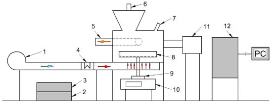 Scheme of hybrid dryer. 1. Air blower. 2. AUS controller. 3. AUS preamplifier. 4. Air heater. 5. Air output duct. 6. AUS ultrasound transducer. 7. Pyrometer. 8. Rotatable pan. 9. Pan drive. 10. Electronic balance. 11. Microwave feeders. 12. Control unit, Arrows represents the airflow.