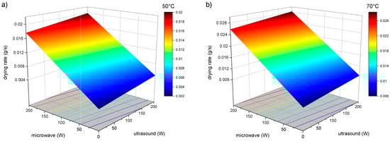 Drying rate (DR) as a function of ultrasound and microwave power at (a) 50 °C and (b) 70 °C.