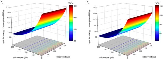 Specific energy consumption as a function of ultrasound and microwave power at (a) 50 °C and (b) 70 °C.