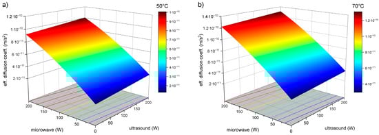 The impact of ultrasound and microwaves on the effective diffusion coefficient identified temperature and radiation energy as influential factors. The hybrid microwave–ultrasound (CMU) process at 70 °C exhibited the highest effective diffusion coefficient, indicating improved mass transfer during drying.