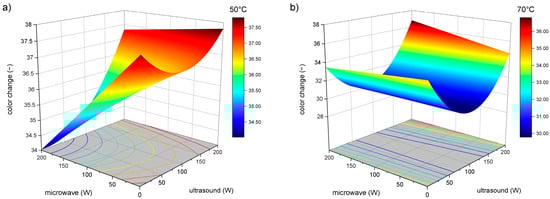 Relative color change as a function of ultrasound and microwave power at (a) 50 °C and (b) 70 °C.