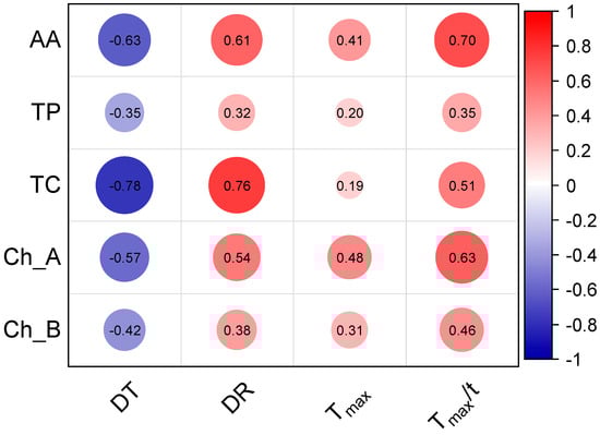 Figure 6 shows Spearman’s rank correlation between the drying time (DT), drying rate (DR), maximum sample temperature (Tmax), rate of temperature increase (Tmax/t), content of ascorbic acid (AA), total polyphenols (TP), total carotenoids (TC), and chlorophylls A and B (Ch_A and Ch_B). As recommended by Evans [59], a strong correlation occurs when the coefficient value is above 0.6 (positive) or below −0.6 (negative).