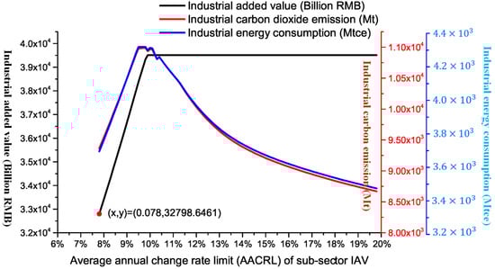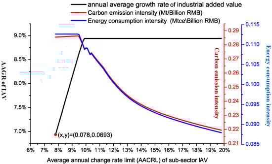 The overall trend of industrial energy consumption intensity and industrial carbon emission intensity has dropped (Figure 5). When the annual average change rate limit of sub-sector industrial added value is more than 7.8% (the average annual growth rate reaches 6.93%), industrial energy consumption intensity and industrial carbon emission intensity can achieve the setting targets. In addition, when the sub-sector annual average change rate limit is more than 9.9%, the average annual growth rate remains unchanged.