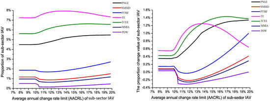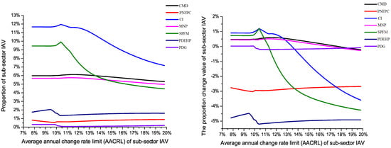 Obviously, the proportion of Chemical Industry (CI) and Smelting and Pressing of Ferrous Metals (SPFM) declined with the annual average change rate limit increases. Moreover, the proportion of other sub-sectors’ industrial added value has little change with the increase in the annual average change rate limit. When industrial added value remains unchanged (the annual average change rate limit exceeds 9.9%), we find that the optimized proportion of sectors with high industrial energy consumption intensity and industrial carbon emission intensity is lower than the initial proportion, including Petroleum and Nuclear Fuel Processing and Coking (PNFPC) and Production and Distribution of Electric and Heat Power (PDEHP), etc. Simultaneously, the proportion change value of industrial added value in some sectors with low industrial energy consumption intensity and industrial carbon emission intensity are negative and the value is small. In addition, the highest and lowest proportion of each sub-sector industrial added value are different. When the range of the annual average change rate limit is between 10% and 15%, they can achieve the optimal proportion. This means that when an appropriate annual average change rate limit is chosen, the adjustment of the sub-sector industrial added value has a critical impact on energy conservation and emission reduction.