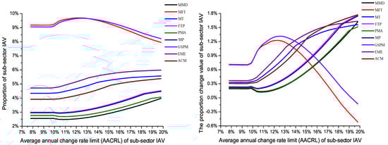 Simulation results show that when the annual average change rate limit of sub-sector industrial added value is more than 7.8%, both the industrial energy consumption and CO emissions setting targets can be achieved. Simultaneously, the targets of industrial energy consumption intensity and industrial carbon emission intensity can both be achieved. When the annual average change rate limit is more than 9.9%, the industrial added value remains unchanged. But energy consumption and CO emissions decrease as the annual average change rate limit increases. In view of this condition, we discuss the proportion and proportion change value of the sub-sector industrial added value. The proportion change value represents the proportion of industrial added value in the optimized sub-sector in 2020 subtracted by the proportion of industrial added value in the initial sub-sector in 2010. The specific results are shown in Figure 6, Figure 7 and Figure 8. Among of them, Figure 6 shows the proportion and proportion change value of industrial added value of high industrial carbon emission intensity and industrial energy consumption intensity sectors. Figure 7 and Figure 8 show the proportion and proportion change value of industrial added value of low industrial carbon emission intensity and industrial energy consumption intensity sectors.