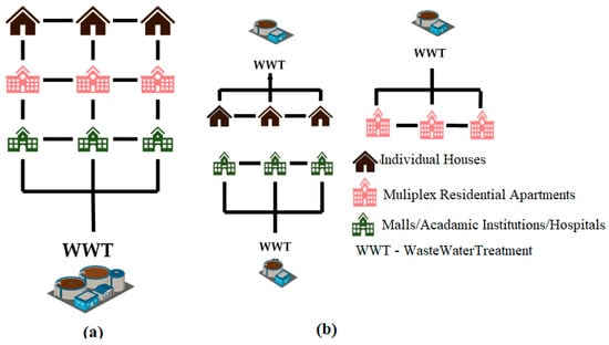 Schematic of different types of greywater treatment facilities: (a) centralized treatment; (b) decentralized treatment.