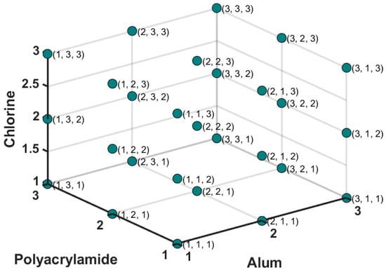 Greywater samples obtained from Abu Dhabi University are placed in three 150 mL flasks. Alum, polyacrylamide, and sodium hypochlorite are purchased from Green Water Treatment Solutions LLC, Abu Dhabi, UAE. pH is measured with a benchtop pH meter supplied by Thermo Scientific Orion Star A211, TDS is measured with a conductivity meter and using the APHA method 2540 C, TSS is measured using HACH LXV322.99.00001 and APHA method 2540D, BOD (5 day) and COD are measured based on titration using APHA 5210B and APHA 5220 C methods, respectively. After measuring the pH, total suspended solids (TSS), total dissolved solids (TDS), biological oxygen demand (BOD5, referred to as BOD in general), and chemical oxygen demand (COD) of the initial sample, three different amounts of alum (20, 25 and 30 mg/L) are added to the three flasks containing greywater to achieve coagulation. Uniform and rapid mixing is conducted by using a magnetic stirrer bar. After one minute, three samples of 25 mL are collected for analysis, and the experiment is continued by adding polyacrylamide (PAM) at three levels (0.6, 0.8, and 1.0 mg/L), facilitating flocculation. After taking the samples from this step, sodium hypochlorite is added at three levels (0.04, 0.08, and 0.12 mL/L) for the chlorination step. After chlorination, the corresponding samples are collected. With alum, polyacrylamide, and chlorine (as sodium hypochlorite) at three levels each, a factorial design of 33 = 27 experiments is conducted. The measured quantities (output variables) are pH, TDS, TSS, BOD, and COD. Three-factor levels 1, 2, 3 are used for alum, polyacrylamide and chlorine. Figure 2 shows the complete design of a 3-level, 3-factor full factorial design.
