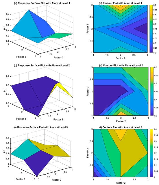 Response surface plot for pH vs. Factor 2 and Factor 3 levels with alum at (a) level 1, (c) level 2; (e) level 3. (b,d,f) are contour plots corresponding to (a,c,e), respectively.
