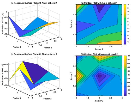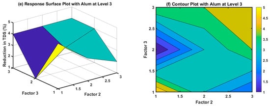 Response surface plot for the reduction level in TDS (%) vs. Factor 2 and Factor 3 levels with alum at (a) level 1, (c) level 2; (e) level 3. (b,d,f) are contour plots corresponding to (a,c,e), respectively.