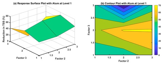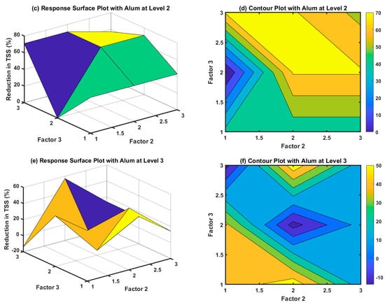 Response surface plot for the reduction level in TSS (%) vs. Factor 2 and Factor 3 levels with alum at (a) level 1, (c) level 2; (e) level 3. (b,d,f) are contour plots corresponding to (a,c,e), respectively.