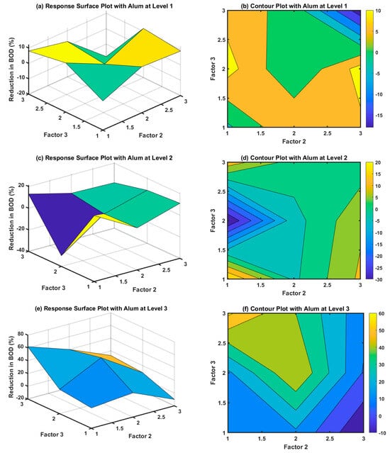 Response surface plot for the reduction level in BOD (%) vs. Factor 2 and Factor 3 levels with alum at (a) level 1, (c) level 2; (e) level 3. (b,d,f) are contour plots corresponding to (a,c,e) respectively.