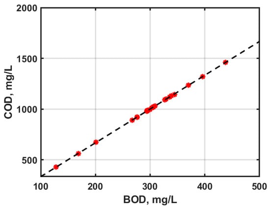 COD vs. BOD of the treated greywater samples (see Table 2 for different factors).