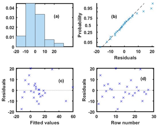 Validation indicator plots for the model: (a) histogram of the residuals; (b) normal probability of residuals; (c) residuals versus fitted values and (d) case order plot of residuals.