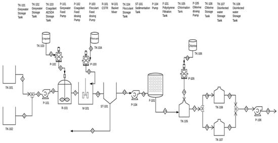 This process consists of mainly three stages: chemical treatment, filtration, and disinfection. Initially, greywater is collected and stored in dual storage tanks, as a critical measure to avoid potential overflow. The untreated water is then pumped to a continuously stirred tank reactor (R-101) where the key coagulant, alum, is added to mainly remove turbidity by neutralizing the charge of suspended particles and allowing for aggregation. To further enhance the effectiveness of coagulation and optimize the process, a coagulant-aid or flocculant, polyacrylamide is added to the greywater as it enters the basket mixer (M-101). This step involves slow mixing, enabling the agglomeration and formation of bigger flocs. Following chemical treatment, the treated effluent is pumped to a sedimentation tank (ST-101), where the resulting flocs settle down due to gravity. The sludge formed at the bottom of the tank containing impurities can be disposed of appropriately. To ensure the elimination of any remaining contaminants, the treated greywater is directed to a polystyrene filtration unit (F-101). Polystyrene (PS), which can be recycled, effectively remediates organic matter and dyes [36,37,38]. Finally, the filtered water goes to the disinfection tank (TK-105) where sodium hypochlorite (which releases chlorine) is added. This step is very important to remove any harmful pathogens in the water. Finally, twin storage tanks receive the disinfected water from where it can be pumped to designated sources. The detailed design and parameters of each piece of equipment are provided in the Supplementary Information (see Tables S1–S7).
