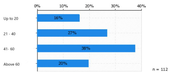 In this section, we provide the findings of the quantitative data (collected by the online questionnaire) using tables and graphs. Through the online survey tool 1 KA, the questionnaire was distributed to all the contacts with Slovenian email addresses in the New University repository in May 2023. This resulted in a total of 112 totally completed surveys. Out of the 112 respondents, 43 (38%) were men and 69 (62%) were women. The participants were divided into four age groups: up to 20 years of age (15%), 21 to 40 years (27%), 41 to 60 years (38%), and above 60 years (20%) (Figure 1). Moreover, most of the participants (71%) were employed persons, 23% were students, and 6% were pensioners. The age groups were defined according to life periods. The age of 20 years marks the period of adolescence and schooling. Age 21–40 years marks a period of young adulthood with developing careers and establishing partnerships and families. The age of 41–60 years indicates a mature period of adulthood with an established career and a family with older or mature children. An age of over 60 years is an older period with a slower pace of life and greater attention to health. We believe that for the study of the responses to different contents of the view, such a definition of groups is more suitable than the more common 10-year age division.
