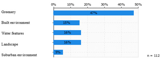 Let us also point out that hedonic valuing [27] has been widely used in real estate assessment. The traditional hedonic model assumes that the pricing of residential real estate depends on its features and location. Usually, the locational features, like the position and distance from the centre, and neighbourhood features, like the social infrastructure, population density, and income levels, are taken into account [29]. Some authors further suggest that the features belonging to the hedonic category (panoramic) view can be related to a substantial increase in pricing [26]. The results of this study indicate that the substantive part of the view is also important. Middle-aged and older respondents mainly preferred views that contained greenery, while young respondents most often chose the built environment. Among the age groups, water motifs were most often chosen by younger adults.