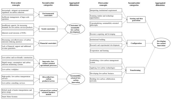 (3) Selective coding. Finally, the categories were abstracted during selective coding into aggregate dimensions that share similar properties and dimension ranges [56]. The aggregate dimensions emerged after a series of iterative processes between theory and data, including constraints on sustainable low-carbon development, developing low-carbon innovation, and sustainability-oriented low-carbon innovation.