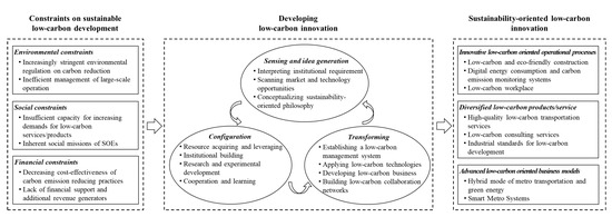 State-owned enterprises (SOEs) encounter various constraints on sustainability in low-carbon development due to institutional hybridity. This study aimed to examine how SOEs develop sustainability-oriented innovation (SOI) toward low-carbon development. Drawing on a case study of Shanghai Metro, we developed a process model for sustainability-oriented low-carbon innovation (SLI) in SOEs. The model illustrated that implementing a national low-carbon strategy introduces environmental, social, and financial constraints on sustaining value pluralism for SOEs, triggering the actors to develop SLI involving sensing and idea generation, configuration, and transformation, resulting in innovative low-carbon operational processes, products/services, and business models which reconcile environmental benefits, financial returns, and social welfare. This paper enriches the emerging research on SOI and extends the existing understanding of low-carbon innovation. Beyond this, the findings also offer a new lens of SLI to the conventional research and managerial practices concerning SOEs’ hybridity and low-carbon development.