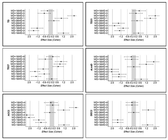 Cohen’s d standardized mean difference (lower and upper 95% CI) of the physical demands among training days for all coaches grouped. Note: TD is total distance, TD21 is high-speed running distance, TD27 is sprinting distance, aLoaD is acceleration load, ACC2 is number of accelerations and DEC2 is number of decelerations. MD-4, MD-3, MD-2, MD-1 and MD+1 are days before (4, 3, 2 and 1) and after (1) day/s of the micro-cycle, respectively.