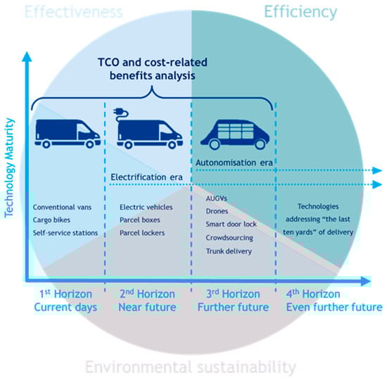 Innovative solutions aim to overcome traditional effectiveness hurdles in a way that may improve customer satisfaction, reduce costs or even discover new business models. The VRP is highly used when analysing options like drone delivery [42] or cost minimization capabilities depending on customer-to-locker assignment [43]. Some papers examine new options [44,45] or new against regular delivery modes [46,47]. Nonetheless, many stumbling blocks remain, for instance, consumer and government reluctance to implement innovations, lack of the necessary technological background, and the issue of the uncertain paybacks from the optimization obtained by innovation [48,49,50]. Boysen et al. (2020) [51] define conventional vans, cargo bikes and self-service stations as status-quo contemporary methods, while drones, autonomous delivery robots (bots or droids), crowdsourcing and reception boxes as near-future concepts. For the further future, ideas on flying warehouses, mobile parcel lockers and autonomous vehicles are presented. Schröder et al. (2018) [52] offer the technology maturity overview with four time horizons, the first representing the current LMD transformation, driven by vehicle electrification and unattended delivery. The second horizon brings semiautonomous delivery vehicles, which in approximately ten years will be supplemented by fully autonomous vehicles and drones during the third horizon. The fourth horizon goes beyond 2030 and only provides optimistic hopes for technologies addressing “the last ten yards” of delivery. Figure 1 illustrates the variety of innovative delivery solutions in accordance with the four time horizons.