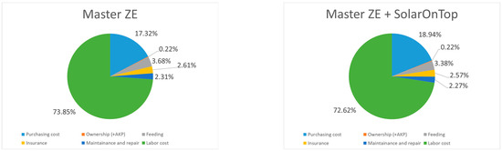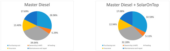 Regarding feeding costs, SOT did not produce significant savings for electric vehicles, not even to overcome the initial technology investment. However, for the diesel Renault Master, savings in absolute terms made up EUR 1518.07 annually, giving an approximate SOT payback period of 3.5 years. Small savings for electric vehicles can be explained by the initial higher fuel-to-wheel efficiency of EV (around 75%) compared to ICE-diesel (around 35%) [119] and the lower price of electricity.
