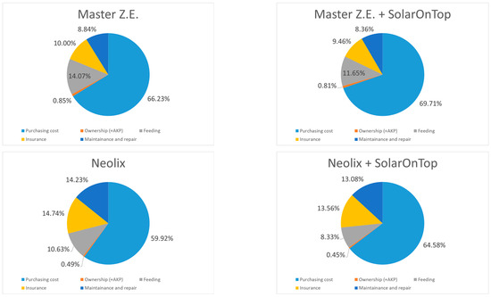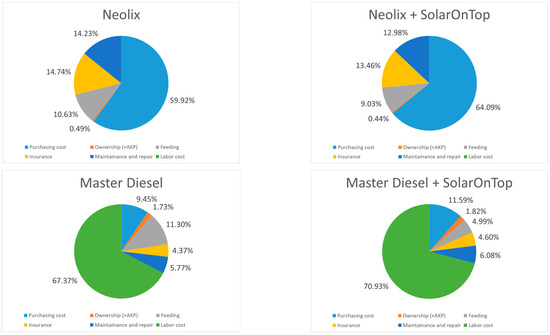 Maintenance and repair (M&R) absolute costs are higher for internal combustion engine vehicles, resulting in higher insurance costs, those being higher for Renault Master Diesel among all options. Interestingly, the relative cost share of M&R for an electric Neolix vehicle is higher (14.23%) than for an electric Renault Master ZE vehicle (8.84%), whereas, for insurance cost, Neolix has the highest relative cost share, obviously due to its lower purchasing cost, although having the lowest insurance cost in absolute terms. It is challenging to assess how exactly autonomy will affect M&R and insurance costs, as many factors may influence their formation, for instance, the price of autonomy-enabling equipment, security and cyber vulnerability of technology, institutional recognition of autonomous vehicles, the weight of driver behaviour, participants involved in the liability system and so on [116,117,118]. However, autonomy has the major advantage of eliminating labour costs, translated into EUR 23,622.5 annual savings, which can be spent to cover potentially higher absolute M&R and insurance costs. With an initial purchasing price of EUR 30,000, Neolix has a very high potential for LMD implementation solely from a cost perspective.