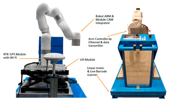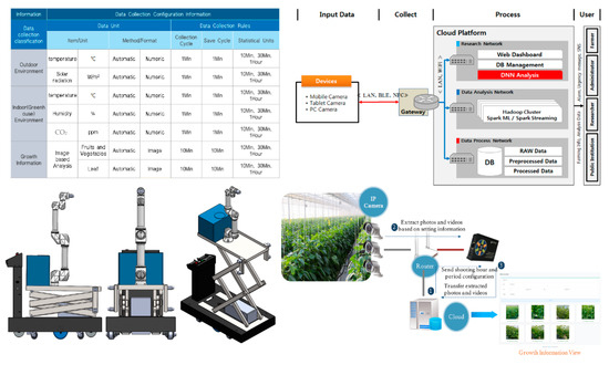 The disease image collection system used in this study utilized a crop image acquisition device developed by the Rural Development Administration’s Smart Farm Development Division. The basic structure is depicted in Figure 4. The image acquisition device, as shown in Figure 5, consists of a robot arm-mounted PTZ-supported RGB camera used for disease recognition in crops, an adjustable lift, a light measurement sensor, temperature and humidity sensors, RTK-GPS for autonomous movement within the greenhouse, a linear motor, and a line-scan barcode scanner integrated into a mobile platform.
