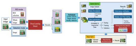 In this study, we performed the setting of Regions of Interest (ROI) and object detection within disease images through a process as shown in Figure 8. One of the significant considerations in this paper was how to enhance detection performance as closely as possible, even when farms and environments change. To train a deep-learning model robust to diverse environments, we employed a method where the user selects areas of interest, considering the changes in the environment, specifically focusing on image regions less affected by environmental changes. These selected areas were designated as unknown regions, and an ensemble technique was applied through iterative processes. Consequently, for five types of disease areas, we achieved an average classification accuracy level of at least 88%, reaching an average of 94%.