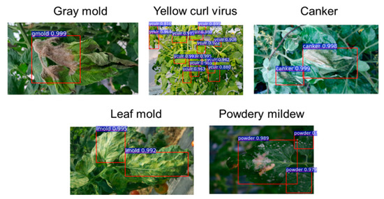 In this study, the data classification technique for the five types of diseases affecting tomatoes (blight, powdery mildew, gray mold, leaf mold, and tomato yellow leaf curl virus) is divided into two modes: object detection mode and Region of Interest (ROI) mode. The object detection mode aims to detect both disease class and bounding box information from the presented images based on research in plant disease recognition [7,8,9,10,11]. In this scenario, the system can detect multiple categories corresponding to various diseases from the same sample image.