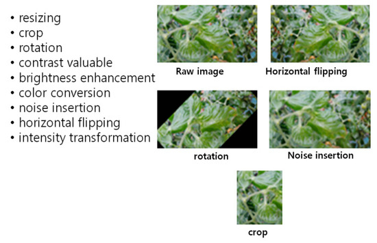 According to the light environment is classified into 3 stages (clear sky, intermediate sky, and overcast sky) based on the solar radiation estimation formula and environmental information. If image data are not detected within 10 s after analysis based on RAW data, or if the similarity is less than 50% in the detection result feedback, data augmentation is determined using the light environment information and disease occurrence probability information. Data augmentation generates up to 9 augmented data per image, such as adjusting image brightness and rotating 90, 180, 270 degrees, up/down, left/right inversion, etc., as shown in Figure 13. It was designed to verify whether there is a similarity improvement of 10% or more based on the feedback data after attempting detection with the augmented data.