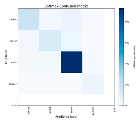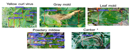 Only four classes of images (yellow curl, leaf mold, canker, and powdery mildew) were available for the field test, and in the case of canker, we used a part of the unlabeled dataset that was not used for the original training, as it is difficult to verify in the field what occurs in general farmers’ fields, as the disease is rare and usually removed immediately after the outbreak.