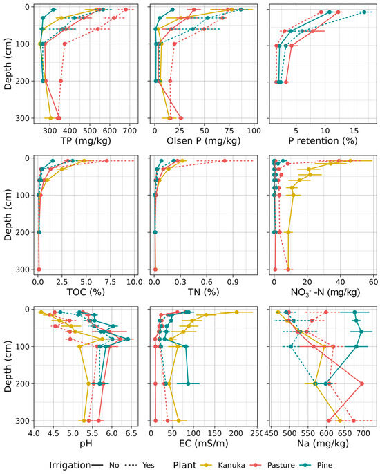 Soil pH was significantly affected by irrigation, vegetation, and the interaction of both (Table 2). Irrigation significantly decreased soil pH under both plant types (pine and pasture) in the topsoil and occasionally at deeper soil horizons (Supplementary Material). Soil under kānuka had a significantly lower pH than any other treatment, although this difference was less evident at deeper soil depths (Figure 2 and Supplementary Material). Soil Na was significantly higher under irrigated than non-irrigated pasture, but only at the 0–60 cm soil depths. These results were contrary for pine, where Na was significantly lower under irrigated than non-irrigated. The soil under kānuka had a lower Na concentration in the topsoil horizons than the rest of the treatments, but Na increased with depth (Figure 2). Irrigation did not affect EC and P retention results, except as an interaction with vegetation (Table 2). EC was generally higher under kānuka in the whole soil profile, similar to NO3− results. P retention was only different between treatments in the topsoil, where irrigated pine presented a significantly higher P retention than the rest of the treatments.