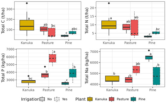 The soil stocks of C, N, P, and Na in the 0–80 cm of soil under each vegetation type and irrigation and non-irrigation are shown in Figure 4. Irrigation with TMW did not result in significant differences in C stocks, and the differences depended on vegetation type. Soil carbon stocks were most variable under kānuka, varying from 50 t ha−1 to >300 t ha−1. Soil C stock under kānuka (~130 t ha−1) was significantly higher than in soil under irrigated pasture and non-irrigated pine (<50 t ha−1). C stocks in soil under non-irrigated pasture (~100 t ha−1) were significantly higher than under non-irrigated pine. Similarly to C, soil N stocks did not differ between irrigated and non-irrigated areas, and the biggest difference was found between kānuka and pasture (~7–10 t N ha−1) with significantly higher N stock than pine (<5 t N ha−1).