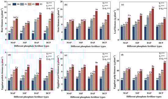 Effect of application of different P fertilizers on biomass of various parts of eggplant under cadmium pollution; (a): root biomass; (b): stem biomass; (c): leaf biomass; (d): eggplant pedicle biomass; (e): eggplant peel biomass; and (f): eggplant pulp biomass. Treatments MAP, SSP, DAP, and DCP denote the application of phosphate fertilizer types monoammonium phosphate, superphosphate, diammonium phosphate, and dicalcium phosphate, respectively; and treatments P0, P1, P2, and P3 denote the application of phosphate fertilizer levels of 0, 0.15, 0.25, and 0.35 mg kg−1, respectively. Upper case letters (A, B, C, D) denote significant differences between different P fertilizer types with the same P fertilizer level, and lower case letters (a, b, c, d) denote significant differences between different P fertilizer levels with the same P fertilizer type. The T and L in each column indicate two-way ANOVA significance levels for P fertilizer type and level. ***, p < 0.01.